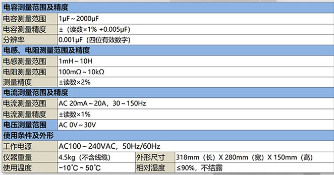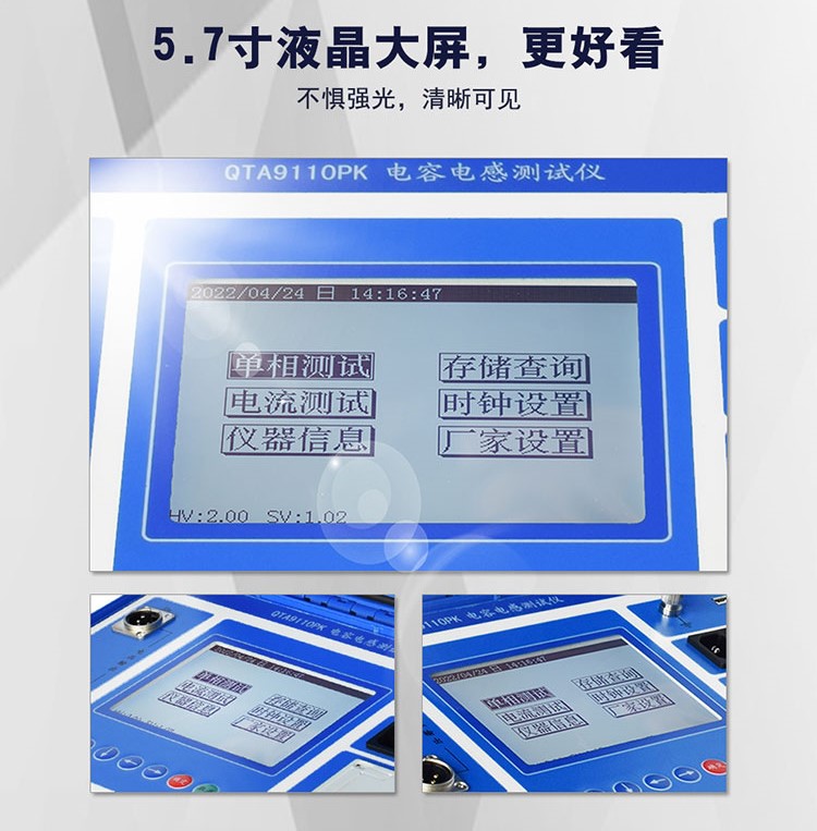 單相電容器、電抗器、電阻器測量時自動識別、補償容量、容抗、感抗、阻抗自動計算、電流測試、電能質(zhì)量分析、5.7大屏、本機存儲200條、可打印