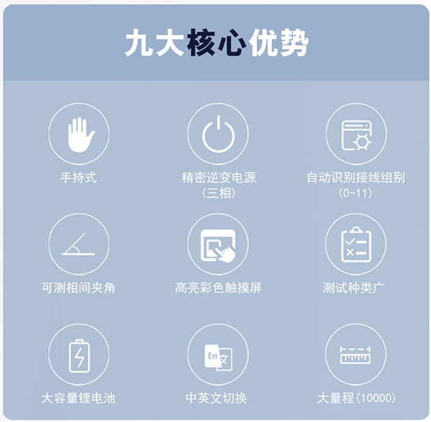 2、 采用三相輸出電壓,提高測試速度,可以測量相間夾角,自動(dòng)識別變壓器接線組別0-11。