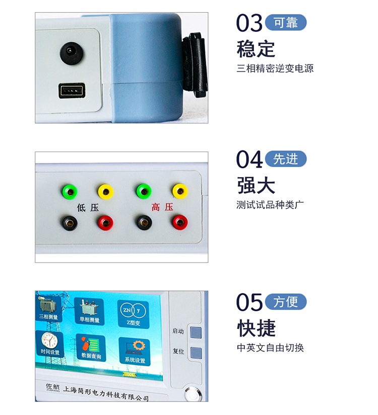 4、 采用自制精密三相逆變電源,具有高低壓反接保護(hù),變壓器匝間短路保護(hù),分接開關(guān)分合不到位保護(hù),輸出全短路保護(hù),增加儀器穩(wěn)定性。