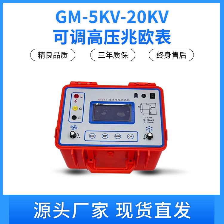 GM-5KV/10KV/15KV/20KV系列可調(diào)高壓數(shù)字兆歐表測試電壓高,功率大,被測量對象往往又帶有工頻泄漏或感應(yīng)上高壓干擾電能,因此為了人身安全,使用該儀器首先一定要接好安全接地線??烧{(diào)高壓數(shù)字兆歐表是為了解決高壓變電站、發(fā)電廠現(xiàn)場強干擾下對大型高壓變壓器、電機電器、遠程電力電纜或埋設(shè)電纜等電氣絕緣電阻特性的測試而設(shè)計研制。它亦可用于廣泛領(lǐng)域的電氣絕緣電阻特性測量。